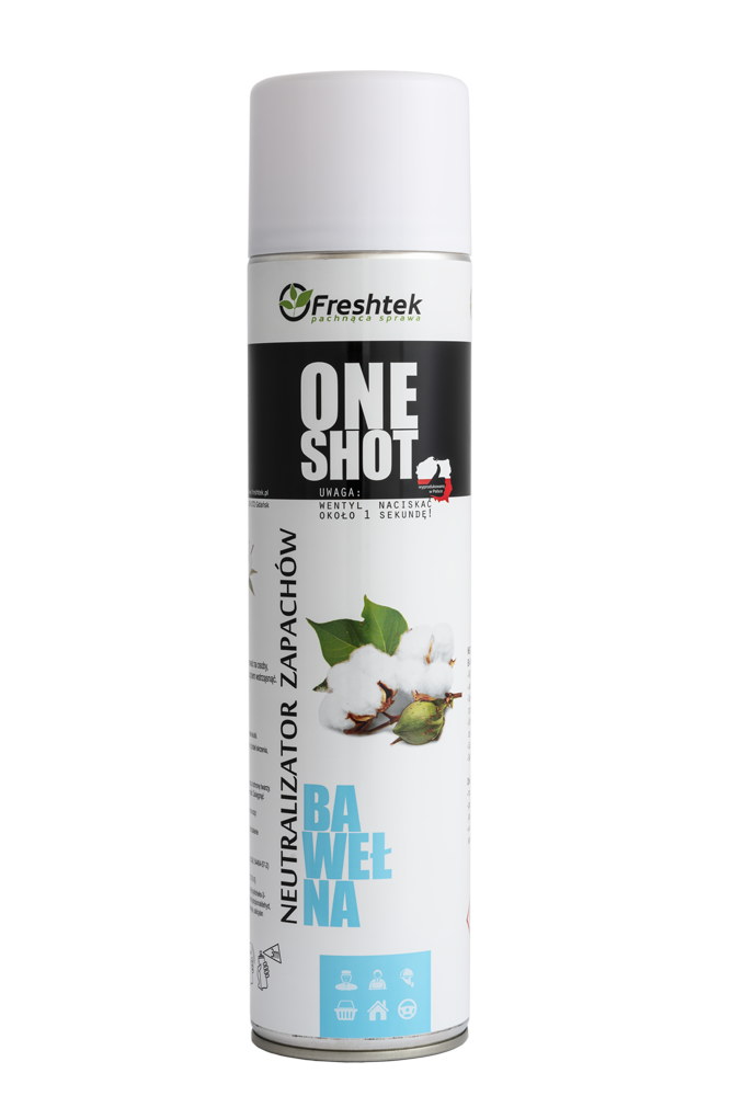 | „One Shot” Bawełna marki Freshtek, o zapachu bawełny, to środek o podwójnym działaniu – odświeżacza powietrza i neutralizatora nieprzyjemnych zapachów. Zapach kojarzony z czystością, balsamem do ciała czy luksusowym mydłem. Określenie „One Shot” oznacza, iż wystarczy jedno przyciśnięcie „spustu”, aby świeży zapach rozszedł się po całym pomieszczeniu. Jest to silnie skoncentrowany aerozol, więc znakomicie nadaje się wszędzie tam, gdzie mamy do czynienia z większą powierzchnią użytkową. |